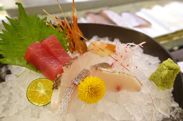 一上桌是一整盆冰鎮的新鮮生魚片,從黃雞魚等白肉魚吃起,清透甜嫩的沁涼口感,牡丹蝦肉質飽滿、甜度美好,最後以黃鰭鮪作為驚豔的壓軸,非常享受的吃完這整套生魚片。