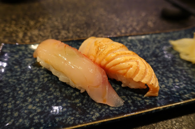 兩貫握壽司,一貫呈現鮮魚的嫩口甘甜、另一貫鮭魚稍微炙燒過,一份握壽司呈現兩種口感,口口都是滿足。