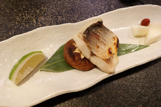 鮮嫩的午魚烤得魚皮脆香,由於事先在魚皮的刀工,讓溫度與滋味都均勻地進入白肉魚身,火侯的調節得宜,魚片吃起來相當柔軟,底下枕著烤香菇,增添了午魚的風味。