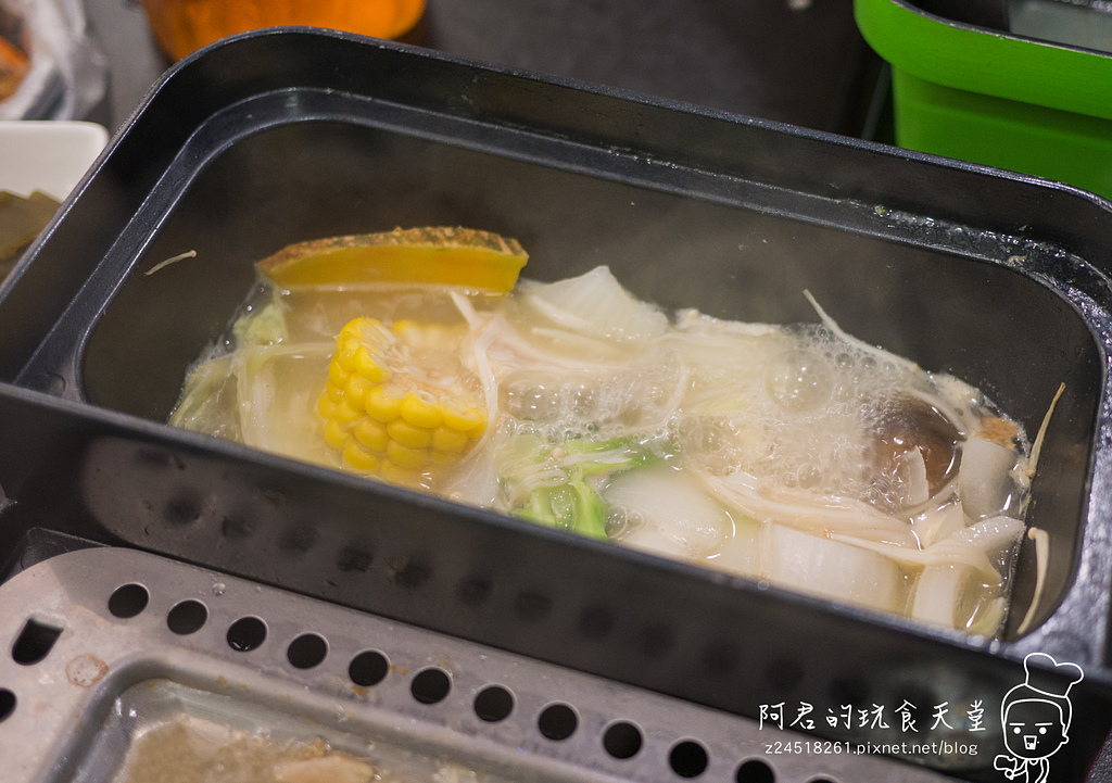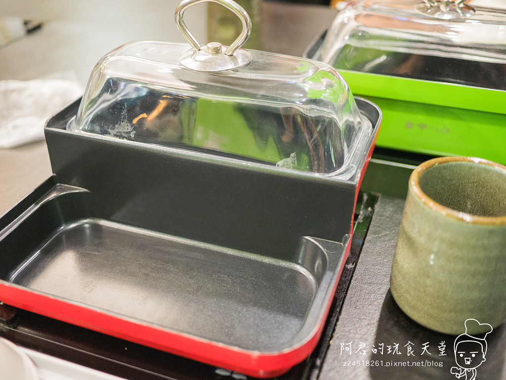 說到這間店,最神奇的就是這個鍋子了,有著多國專利,拿過2015台北國際發明展的鉑金獎以及IENA德國紐倫堡國際發明展第二名銀牌獎,不須調味、不用放油一口氣可以吃到鐵板燒、壽喜燒、蒸海鮮、悶蔬菜,方鍋設計成前後兩個部分,前方較低的鍋子是拿來煎肉、悶菜,當然你也可以拿來炒菜,而後方比較高的是湯鍋,上面則是可以放上特殊蒸盤。