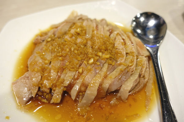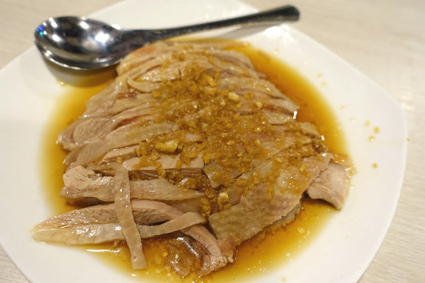 去骨的帶皮雞肉浸泡在鹹甜的醬汁,還撒上點蒜酥哩。