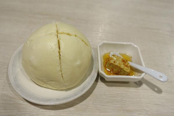 大粒的饅頭形狀有點兒像壽桃,特別的是旁邊還附了一小碟腐乳。