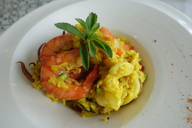 份量不少的番紅花漁夫海鮮燉飯,一端上桌就看得出鮮蝦的肥美,底下還有不少蛤蠣、中捲和一個淡菜,一吃就知道海鮮非常的新鮮,中捲的脆度、口感超好,點菜時侍者特別詢問是否要將米飯煮軟些,柔軟的黃色米飯吸飽海鮮的好滋味自然好吃極了。