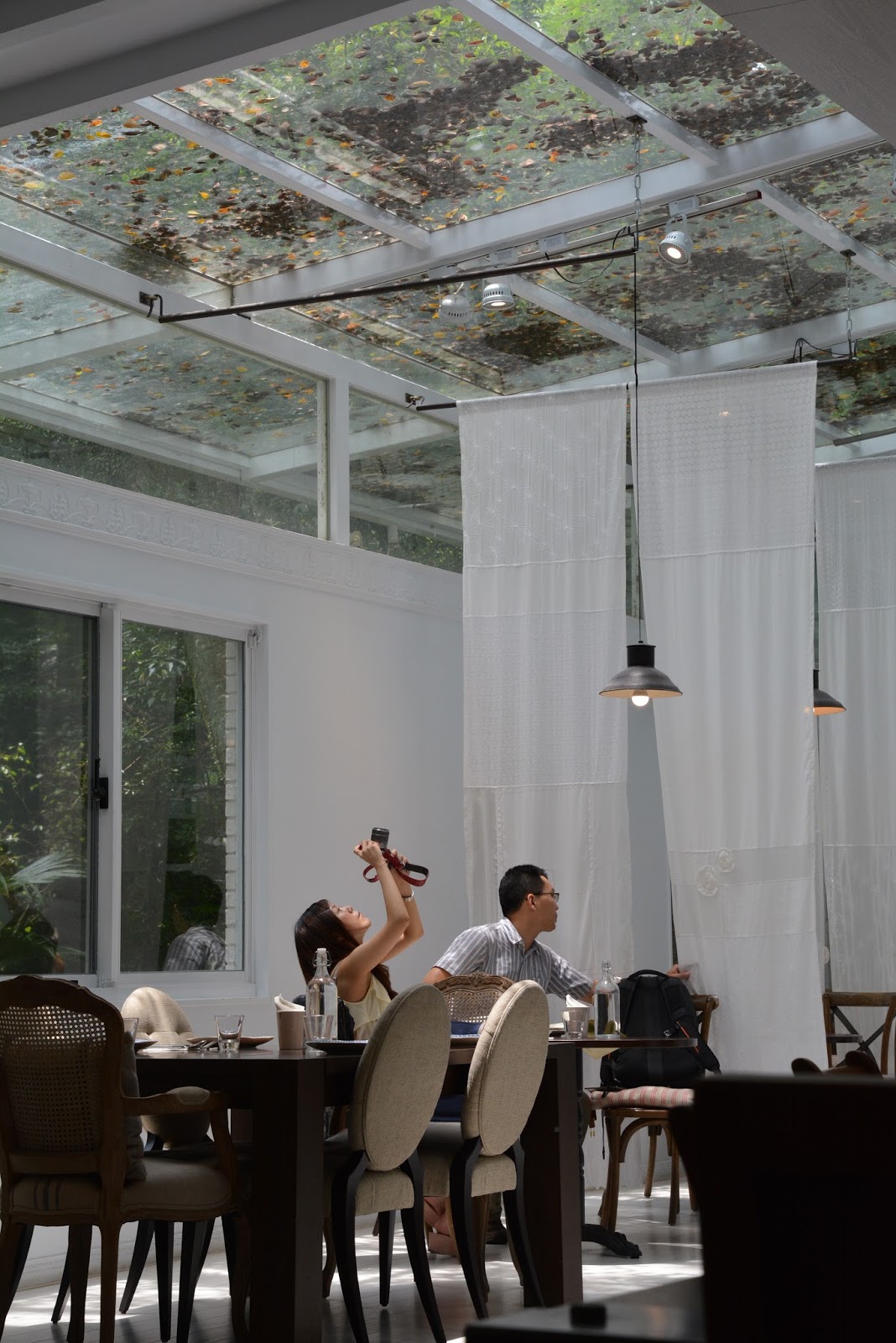 一進到餐廳,眼睛就停不下來,整間白屋相當透亮,陽光透過玻璃時而灑下美麗的樹影、時而歇息,讓屋子內的光線每一刻都在改變,舉頭就能看到綠景盎然,讓整間屋子帶著森林的氣息。