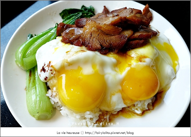 三眼仔飯,其實就是擁有三個粒荷包蛋,不過店家在出菜時,似乎少給一顆了,但是無傷大雅,因為這叉燒飯看起來還是好美味。