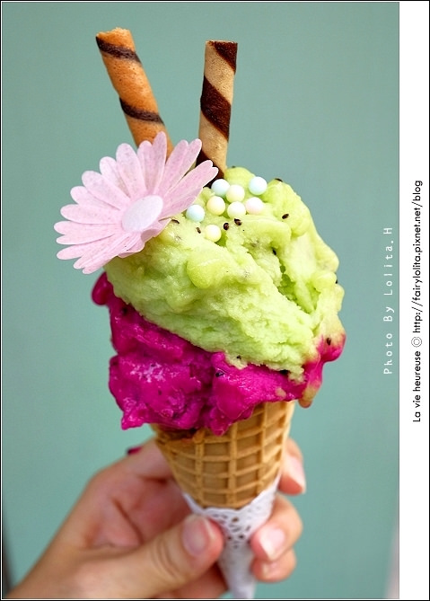 我選了火龍果及奇異果這兩種口味,兩球要價150大洋,加上小花朵的點綴,模樣實在是太討喜了阿!