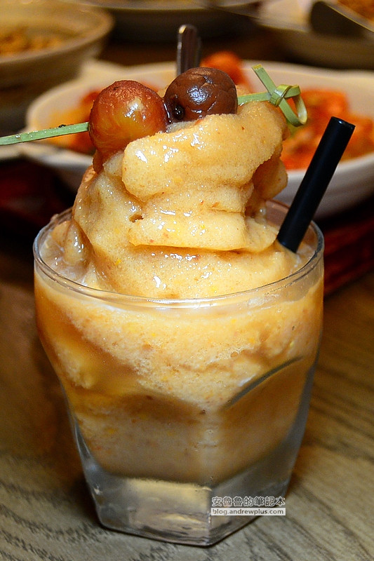 ▼冰沙裡面有番茄的纖維,清涼爽口,再加上醃漬過的酸酸甜甜小番茄和一顆茶梅~吃得火辣的時候,來上一口正正好
