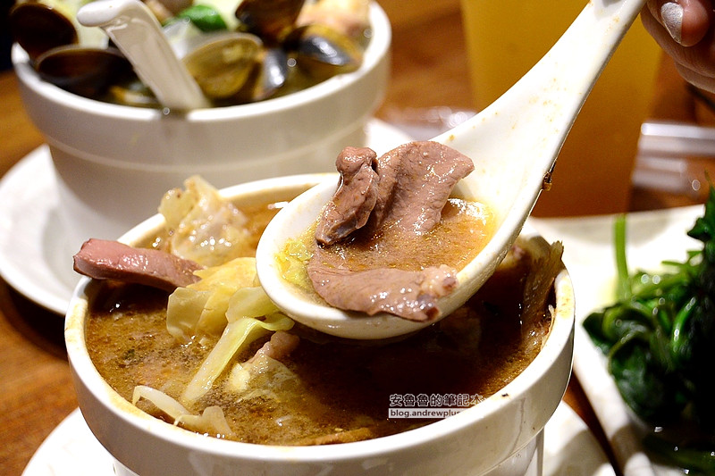 這盅湯一端上桌,傳來陣陣的麻油香氣,裡面的食材有豬心、枸杞、高麗菜以及大量的薑片,雖然放了很多薑片,但是湯頭不會太嗆辣,也沒有麻油煮過頭的苦味,更沒有米酒的嗆味,湯的味道只是縈繞在口腔裡面,卻不會占去整個味覺,只覺得通體舒暢~