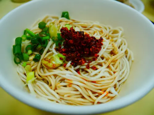 去麵攤我習慣點乾麵配湯,這種天氣單吃湯麵太熱了,福州乾麵的特點就是醬料隨自己增減,烏醋要加多少隨意,蔥花都在碗底記得拌均勻。