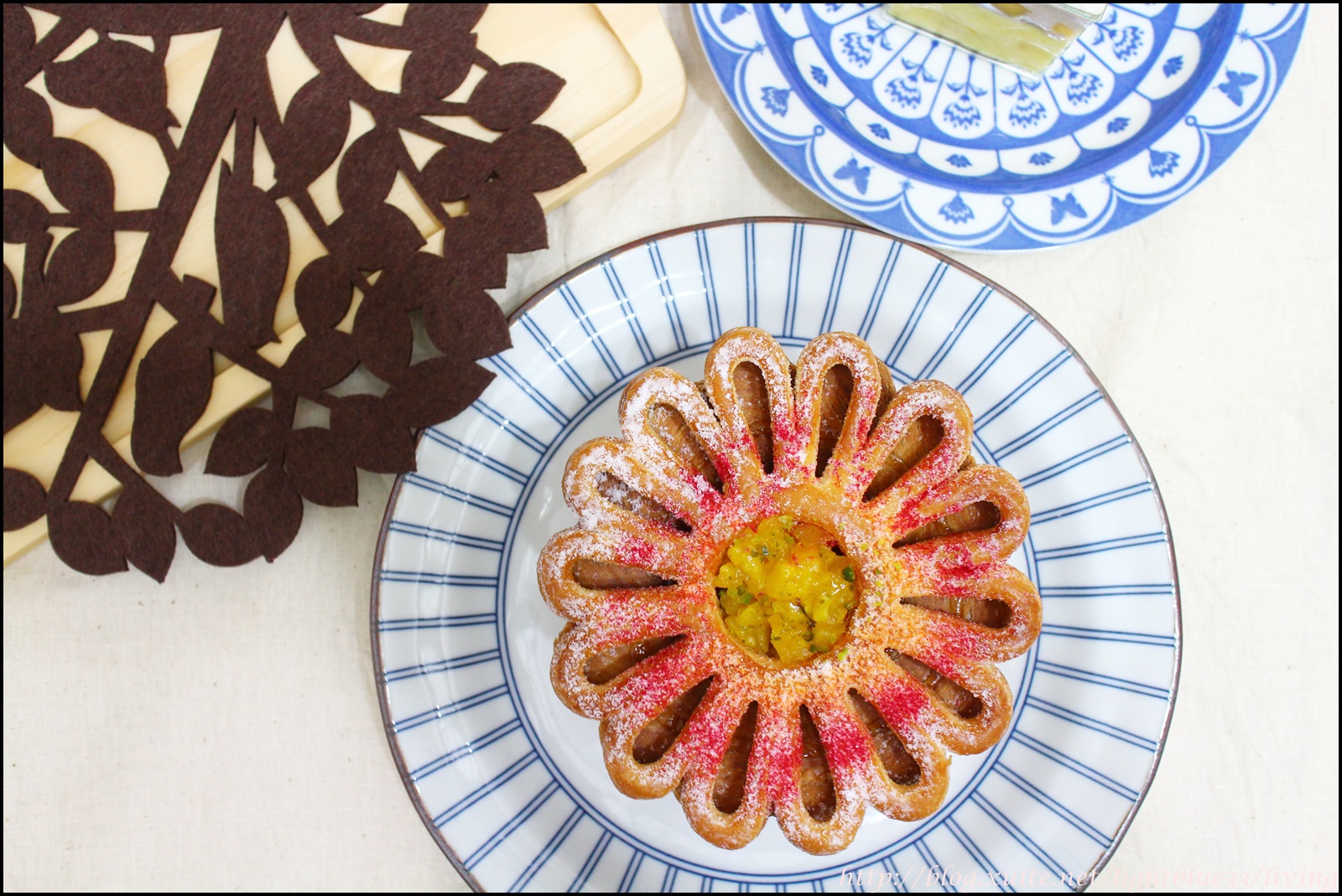 之前在他們粉絲團上看到,我還以為是平面的花瓣狀麵包,結果可是立體的,這款麵包製作可不容易,還特別請工廠開了獨家模具,上層是酥脆可頌,中心是甜甜的鳳梨丁,下層是包裹著許多果乾內餡的柔軟口感布里歐麵包