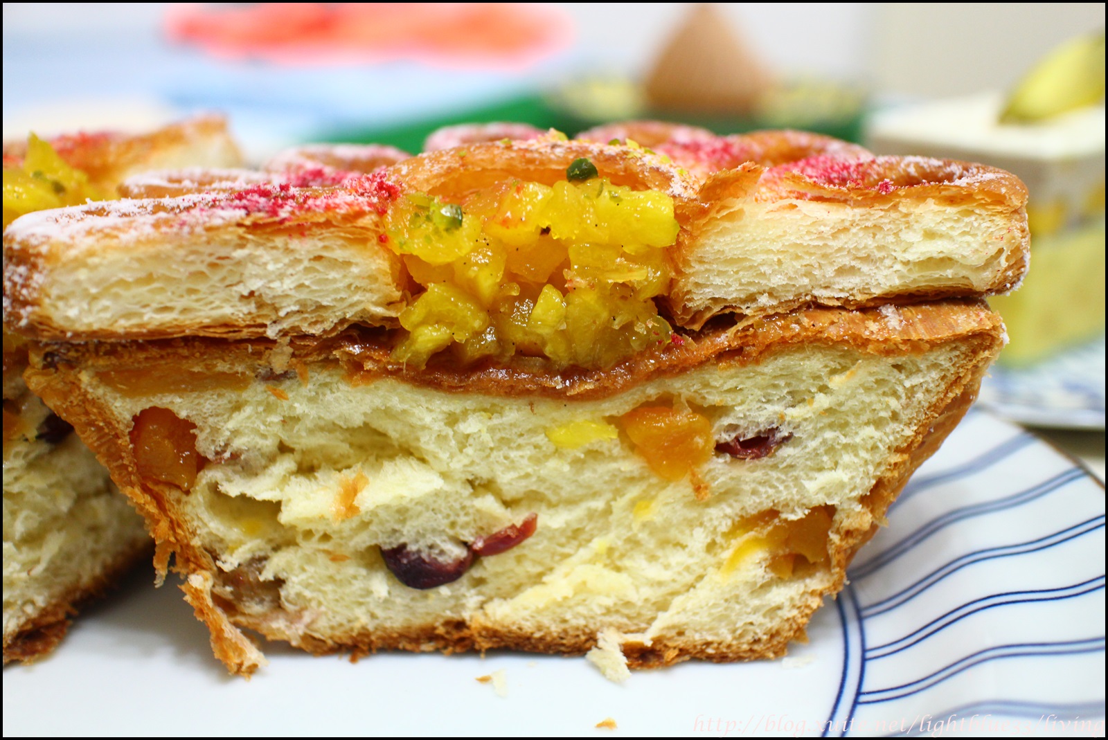 另一個像是大花圈的是我在這次甜麵包當中最喜歡「國王果香麵包」,原來國王派有很多樣貌,這是珠寶盒特製的葡萄牙版國王派,有無花果、杏桃、加州李、橙片等果乾,吃起來依然酸甜多汁,麵包裡頭的小驚喜是杏仁餡,這次麵包的表現真的非常令人驚豔,一點都不輸甜點