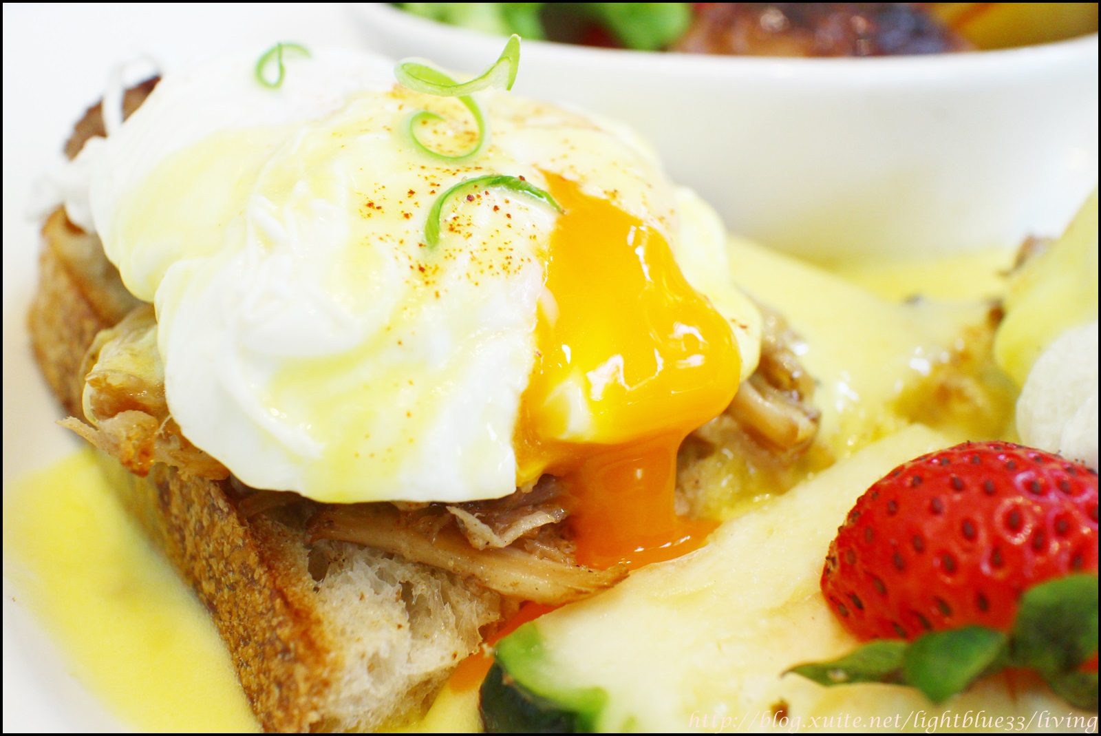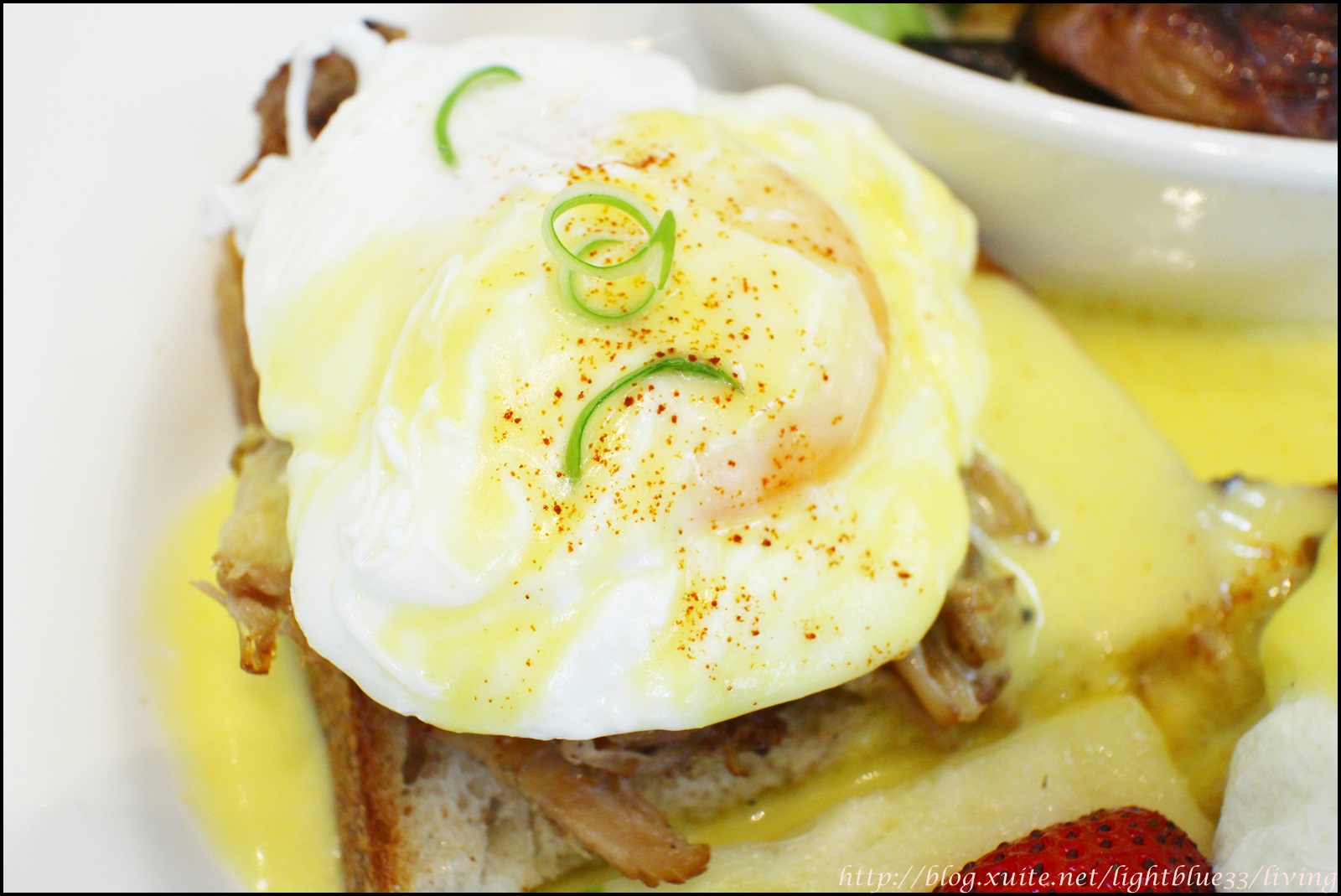 班尼迪克蛋上頭淋了一些荷蘭醬,大部分是都流到盤子裡,想要吃多一點荷蘭醬的人要記得往盤子裡找。