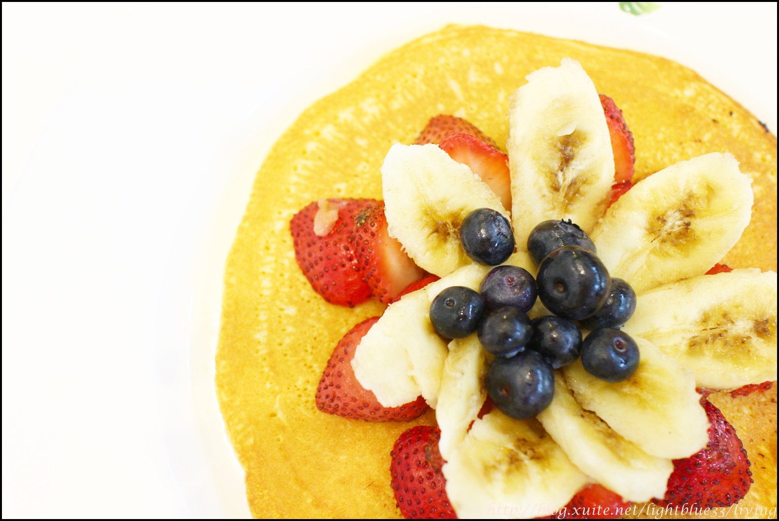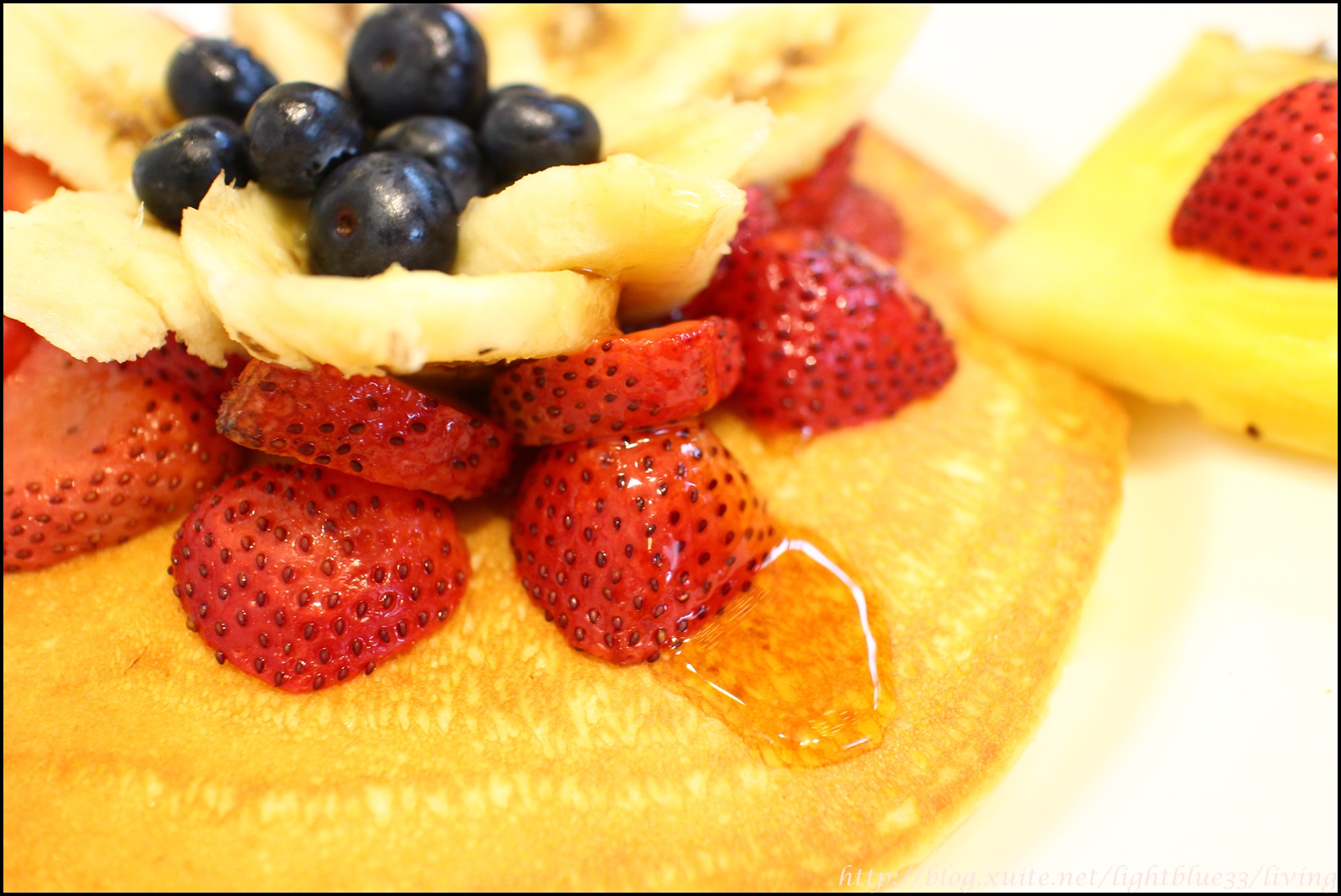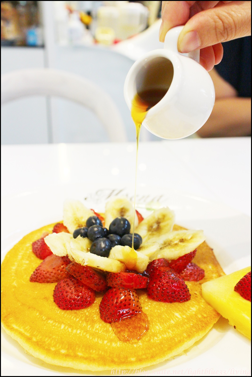 吃完鹹食,綜合水果鬆餅上桌,由草莓、香蕉和藍莓組成,擺盤就有下功夫,呈現立體花朵狀