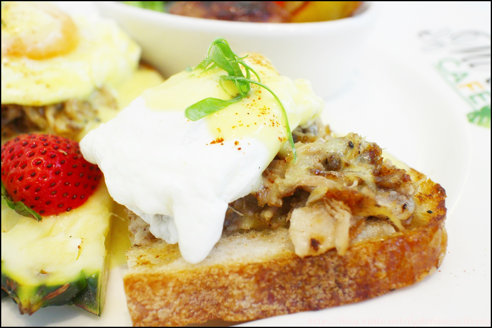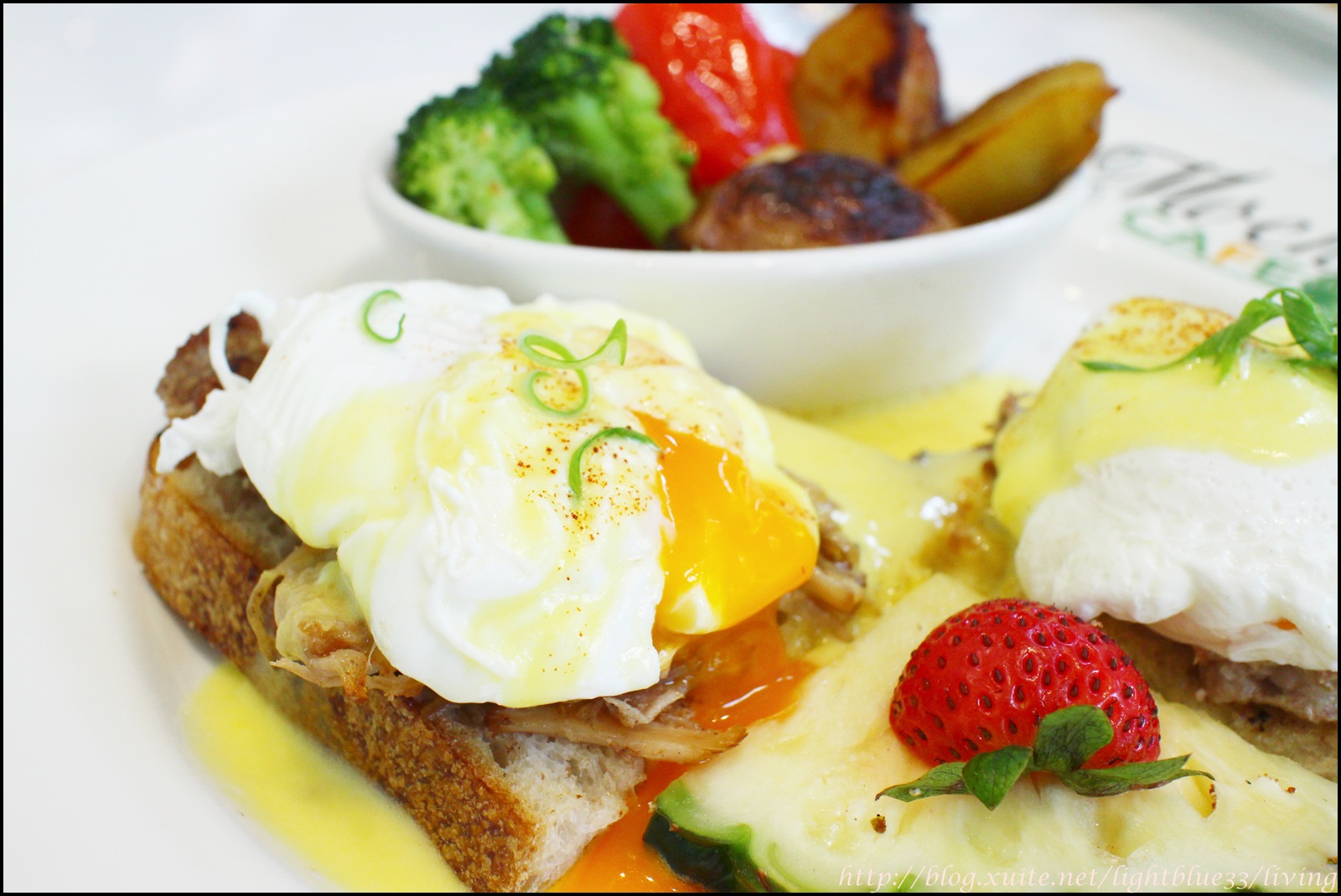 這是手撕煙燻豬加班尼迪克蛋+焙烤青蔬盤,擺盤一樣是簡單路線