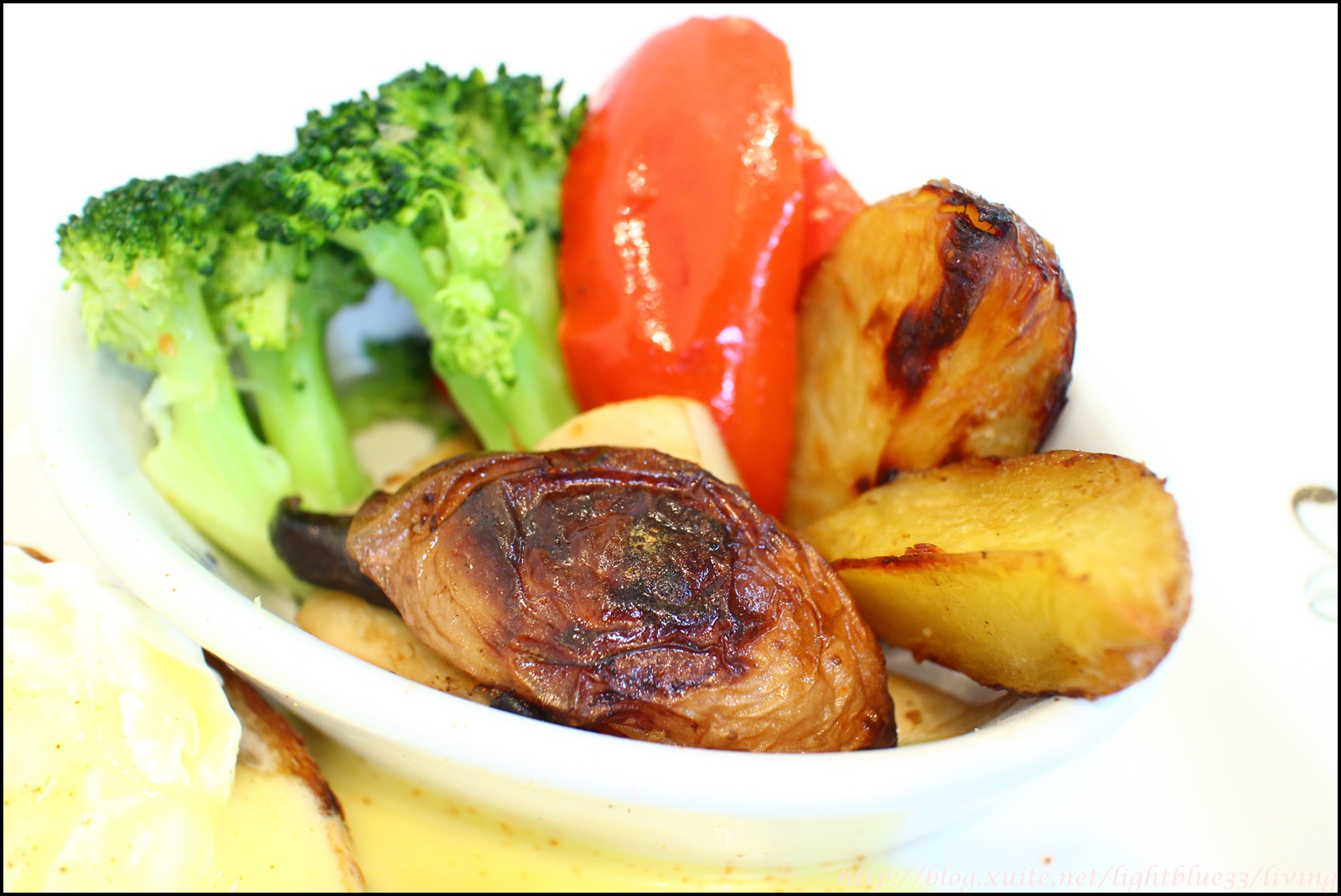 蔬菜盤有綠花椰菜、甜椒、杏鮑菇、馬鈴薯塊,也是簡單調味,但並不會過於淡而無味,有一點烘烤的香氣