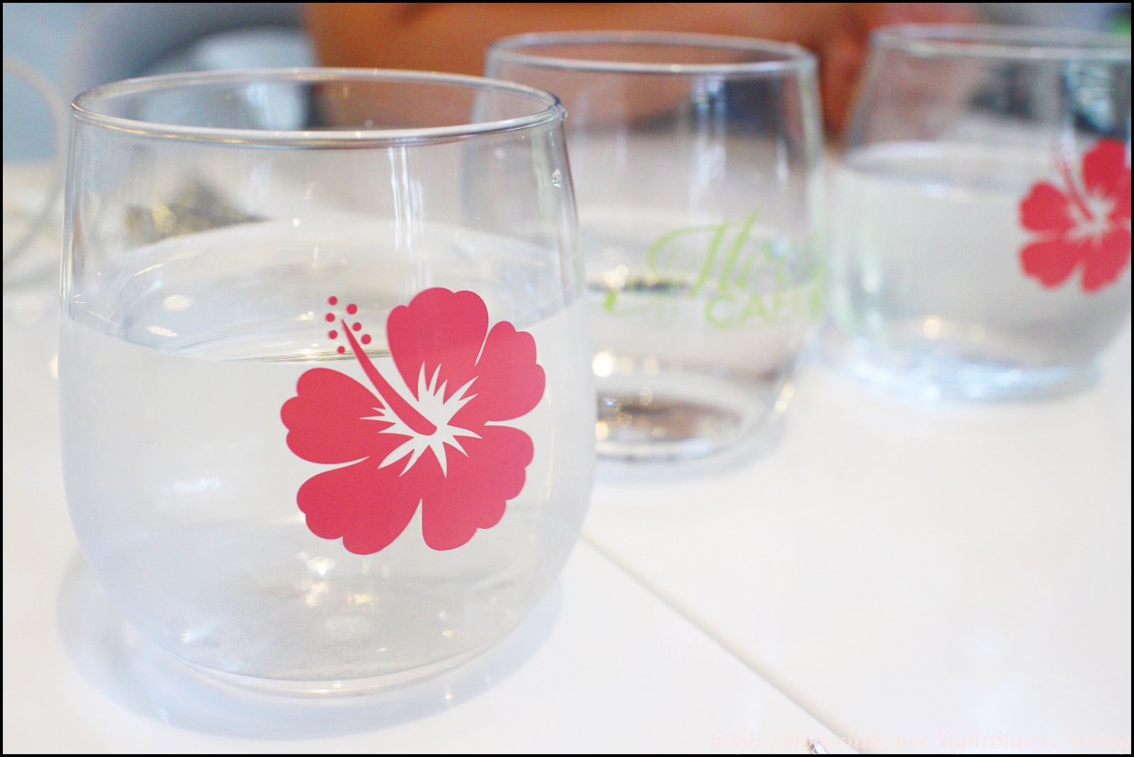 不知道是否因為第一天開張的關係,菜單都在桌上,所以一入桌就可以自己研究,要點菜時再舉手找服務人員來,這沒問題,不過等我們都已經點完餐,服務人員都沒有送上水杯來,一直到我們看到別桌都有水而詢問時,服務人員才送上水來。他們的水杯也印有很夏威夷風情的扶桑花,不過壓了一下發現軟軟的,原來他們的杯子是塑膠製而非玻璃,這是否會再利用還是一次丟棄就不得而知