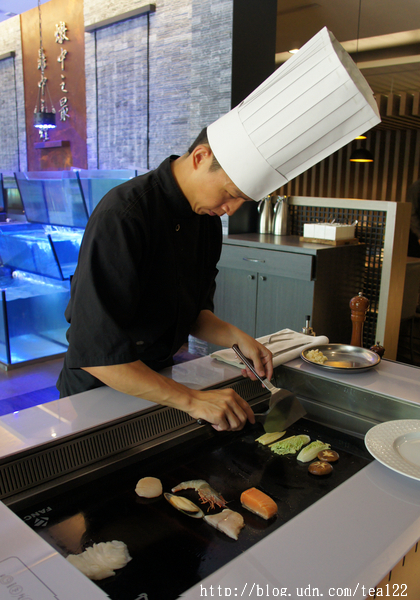 大誇張了吧!我也這麼覺得,當看到這一台有車牌的德製琉璃燒車推到桌前,準備做桌邊服務時,那感覺比樂師到我身旁拉小提琴都還酷。沒有幾個女人禁得起鐵板燒秀的,我早忘了一旁煮沸了的火鍋,全心投入主廚熟稔俐落的手藝,捕捉他快速的身影。酷,認真的人就是帥。