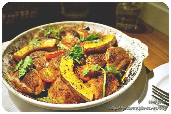 從視覺來說就讓人很驚豔,焦糖色的雞皮、金黃色的南瓜、紅番茄和綠芫荽的點綴,就算吃了兩道份量不少的前菜,依舊讓人食指大動!