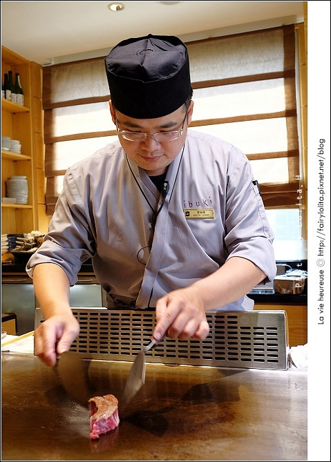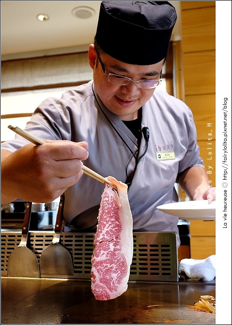 吃鐵板燒就是有這種好處,可以看主廚表現它的絕佳廚藝,尤其在烹煮這和牛沙朗時,深深為它美麗油花而沉醉。