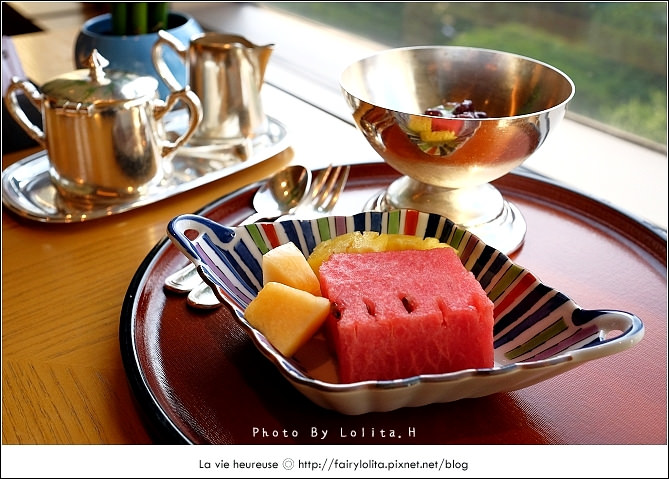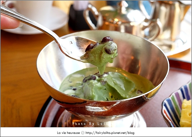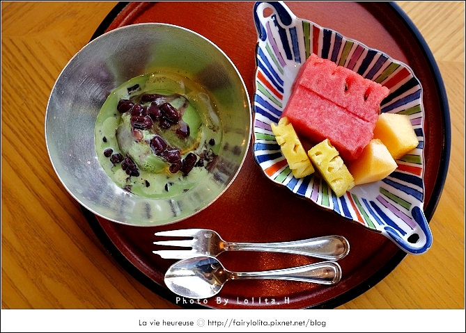 冰淇淋濃郁還伴隨著抹茶特有韻味,與紅豆是完美搭配,一旁也有時令水果幫助消化。