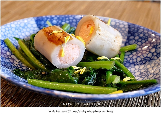 這道完全讓我有種在吃藝術品的感覺,把牛蒡挖成空心,再釀入氣味鮮明的明太子,從來不知道這兩種食材的組合竟是如此契合,牛蒡巧妙中和了明太子的腥鮮味,脆脆口感中還混入細膩顆粒,好特別。