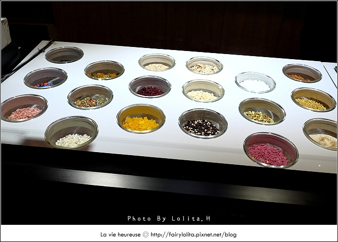 這個雪糕最特別的地方,就是可以DIY自選配料,檯子上擺滿了各式玲瑯滿目的甜點食材,而佐醬則有巧克力、香草及草莓三種,通通都可以隨心所欲自己組合呦!