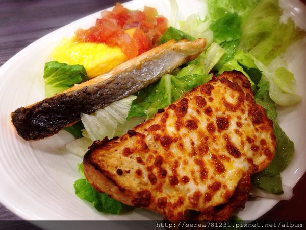 煎烤的香香的鮭魚搭配上半軟煎蛋佐番茄丁