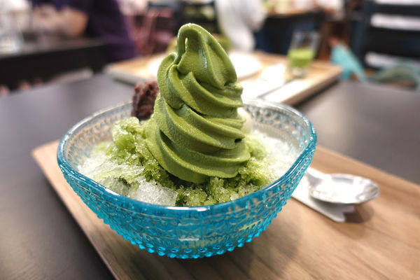 清冰上淋著不甜膩的抹茶醬,還有順著抹茶冰淇淋溜下來的奶味;