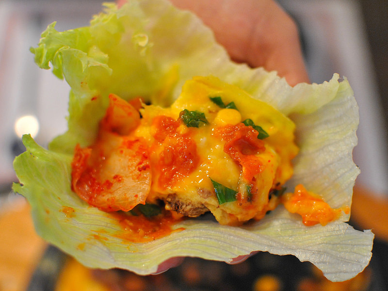 也可以用韓式烤肉的吃法,把漢堡肉切一切,跟配料一起放到生菜裡面,一口咬下、感受豐富的層次變化