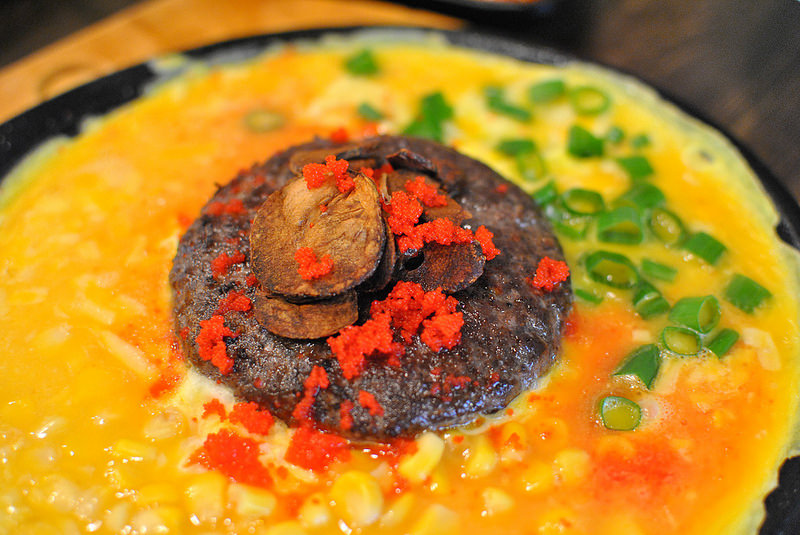 環繞在漢堡排四周圍的是起士跟生蛋液,上桌的時候要趕快攪拌,免得雞蛋沒熟