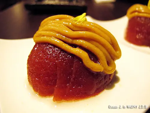 第三道上的菜是擁有奇特菜名,光看菜名猜不出主廚葫蘆裡賣的是甚麼菜的「受盡煎熬」,等端上桌後謎底才揭曉。