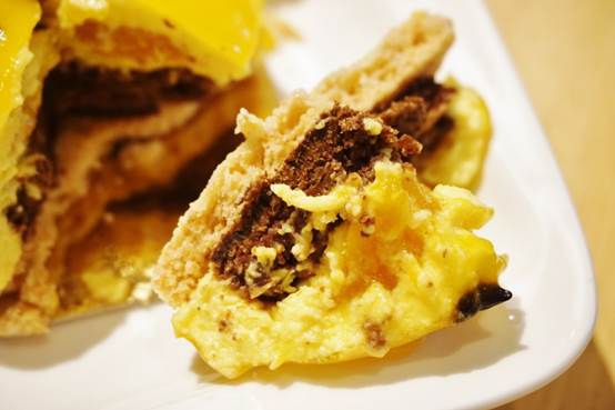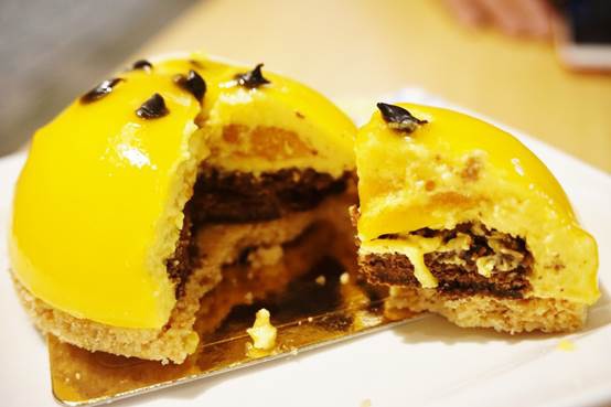 中間有椰子巧克力蛋糕、巧克力脆片、榛果杏仁餅乾,甚至有芒果果肉,口感實在豐富,不在話下。