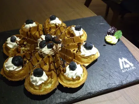 但和外表有點反差的,是口味組合上倒很夏天的感覺:沾著綠色焦糖的泡芙是哈蜜瓜和香草口味,香緹的裡頭還有青蘋果內餡(後來詢問是青蘋果柚子凍和果醬),最底層則是千層派皮。