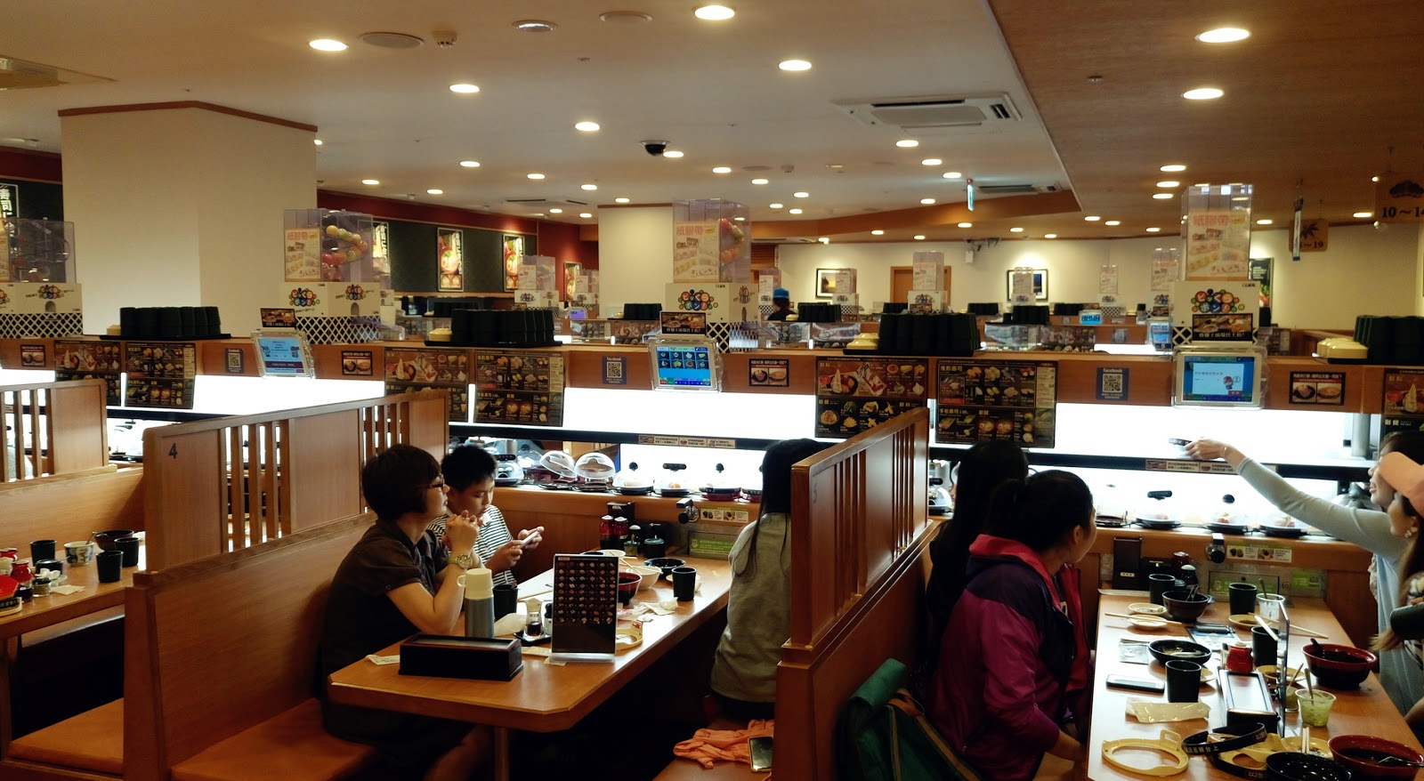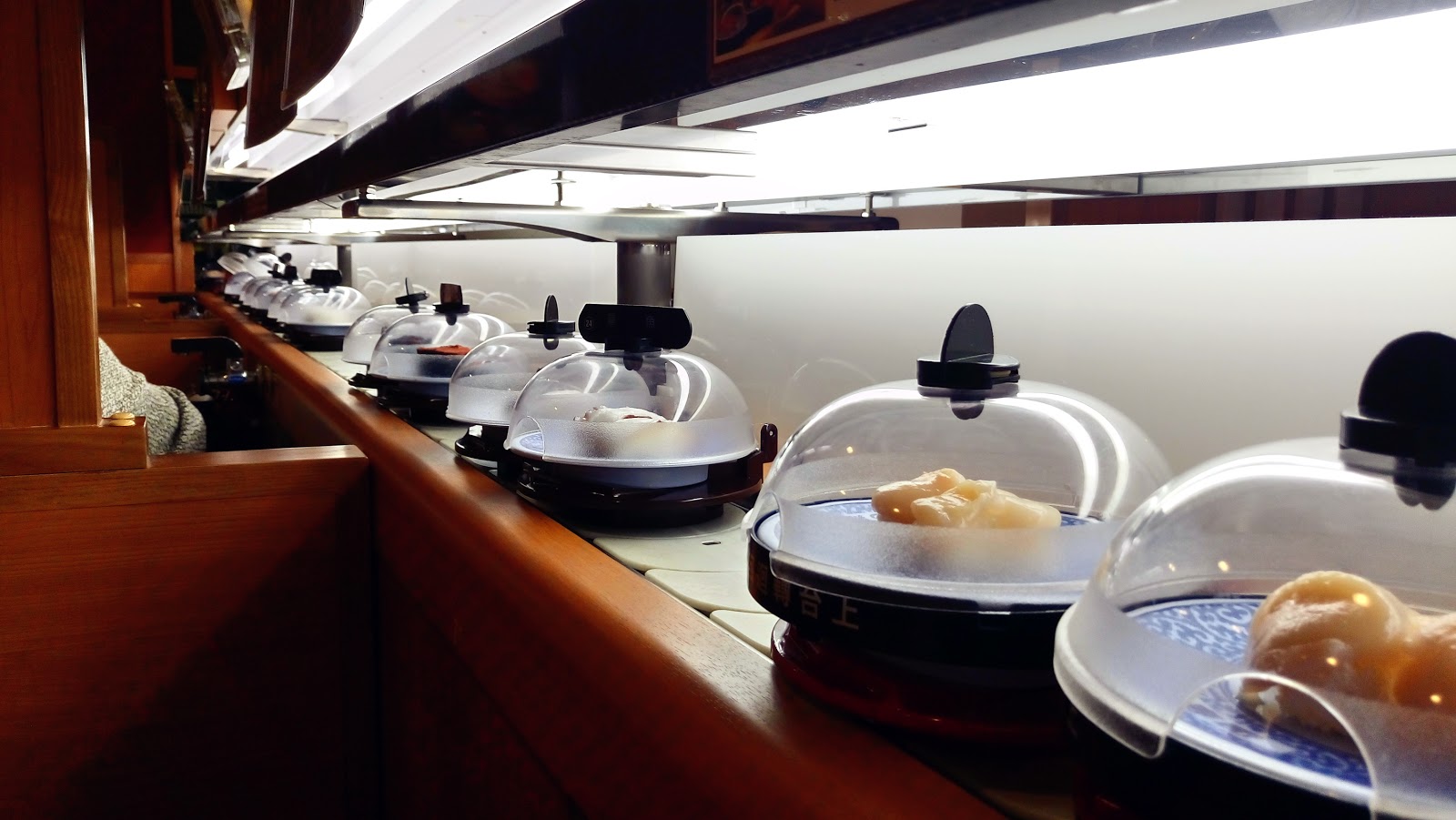 轉盤軌道有兩層,下面就是會循序一直轉,如果想吃某道料理又不想等的話,可以用螢幕上點選,幾分鐘後會在上層的軌道出現