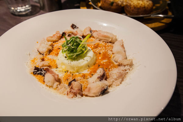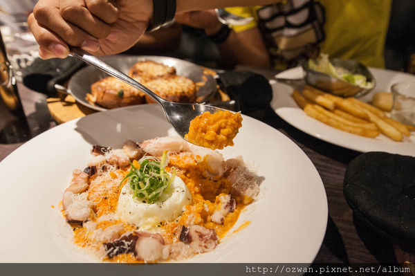 蛋黃汁緩緩流進濃香起司的米飯裡,濕潤滑順的燉飯好吃但有點鹹兒~