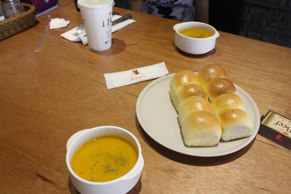 再來是套餐麵包及南瓜濃湯,超QQ的軟綿度,愛吃到不行