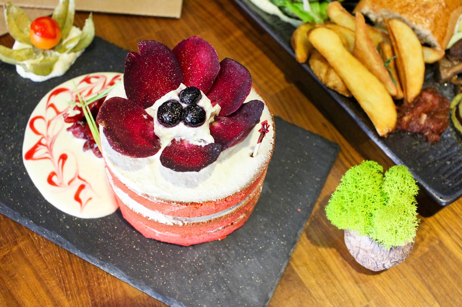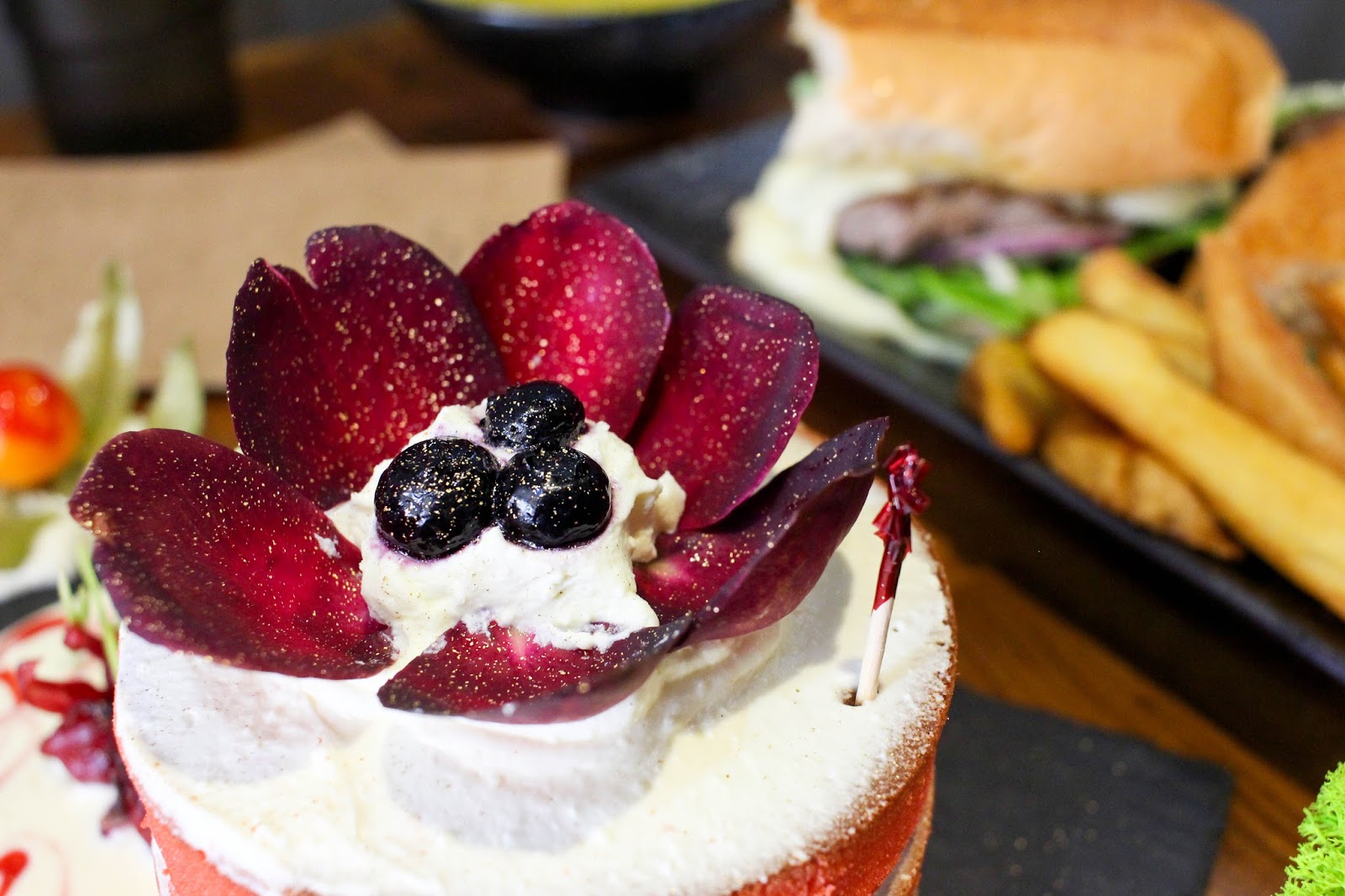 菲力牛排下舖上滿滿的生菜+洋蔥與切成薄片的蕃茄。