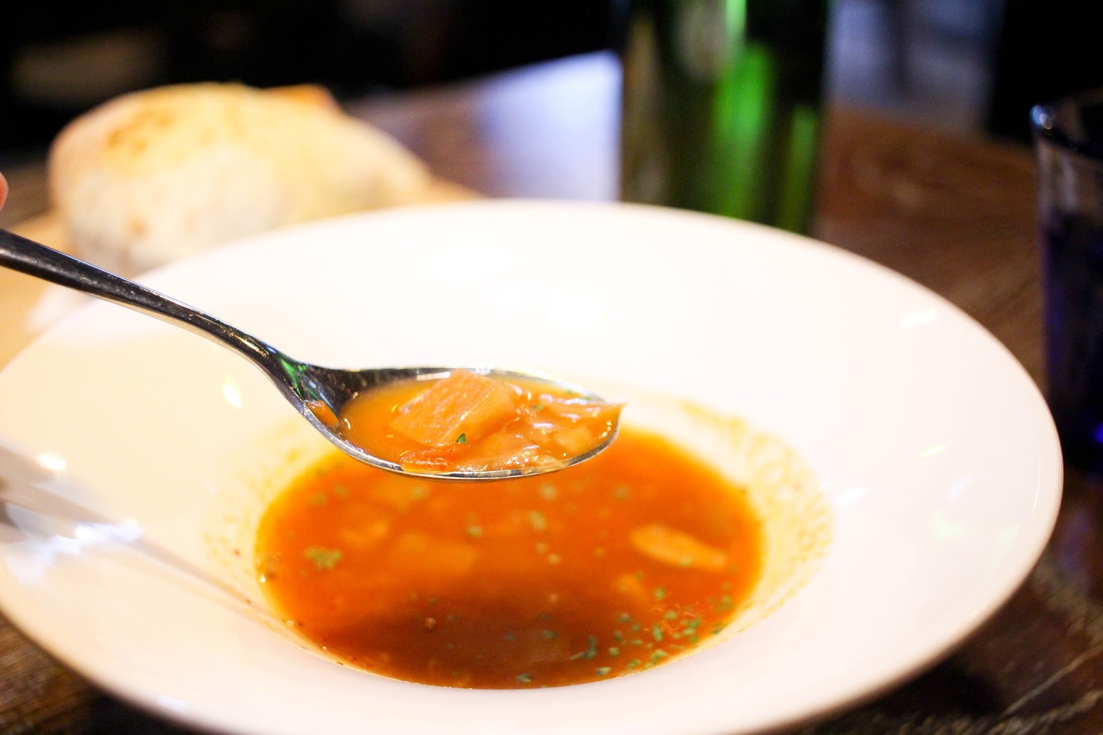 蔬菜湯以蕃茄為基底酸酸甜甜,伴隨著每一次入口都帶著蔬菜鮮甜。