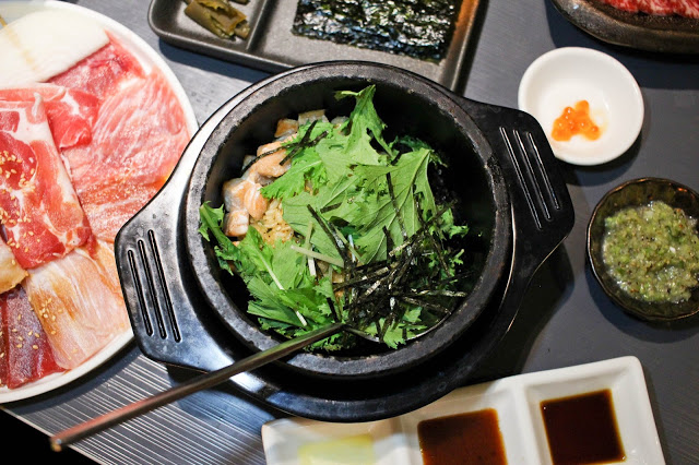 鮭魚拌飯在滾燙的石鍋之中,緩緩冒出熱騰騰的白煙,