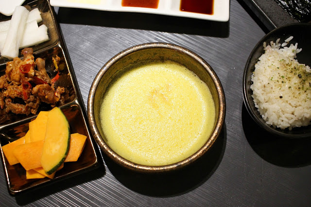 牛肉烤熟之後可以搭配綿密的蛋液。