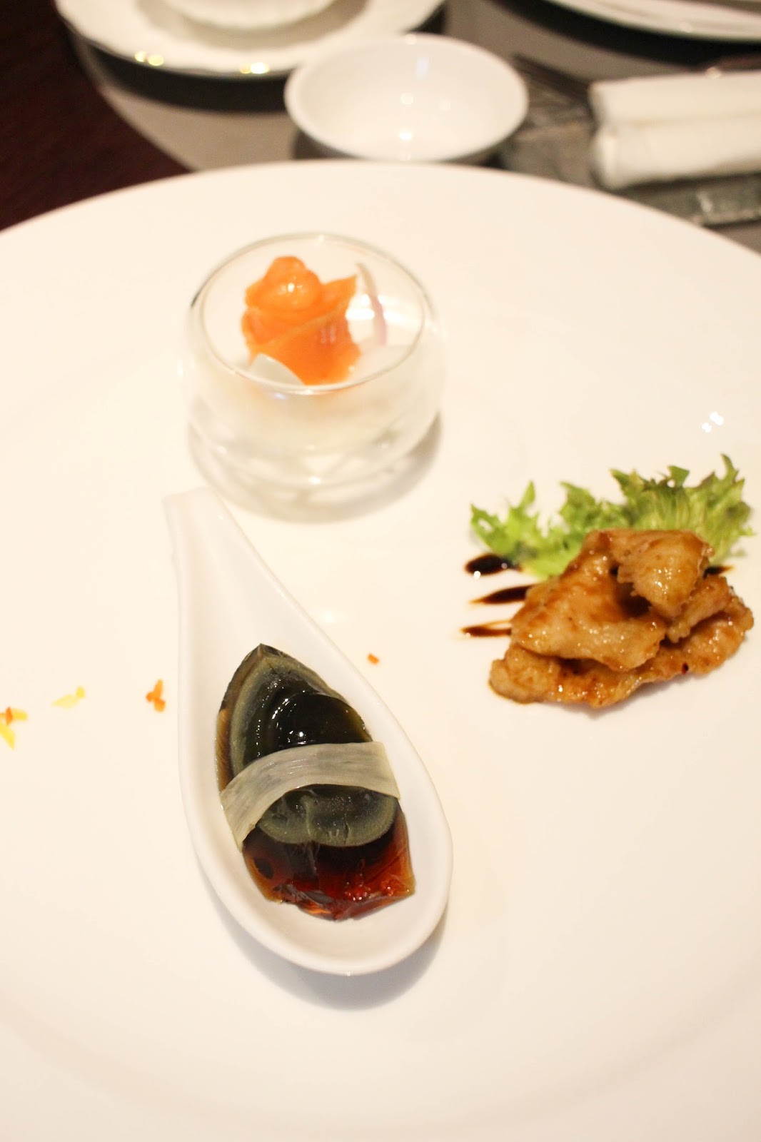 餐前小食由三種開胃菜所組成,分別是燻鮭魚.皮蛋和豬肉,