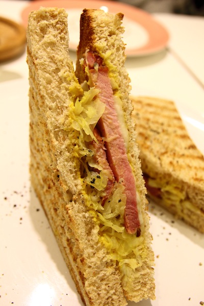 Aranzi的餐點可愛之處在於以人物命名的同時,餐點上也會出現人物的圖樣。如這道三明治所附的竹籤,上頭還有壞東西的小紙片,顯得十分可愛。烤得香酥 鬆脆的吐司,夾著德國豬腳薄片與酸菜,不得不說的是酸菜味比豬腳來的重,吃入口中洋溢著濃濃的酸菜味,少了些肉味實為可惜,不過味道還是挺不錯的,酸菜的 味道並不過酸,顯得十分溫和。