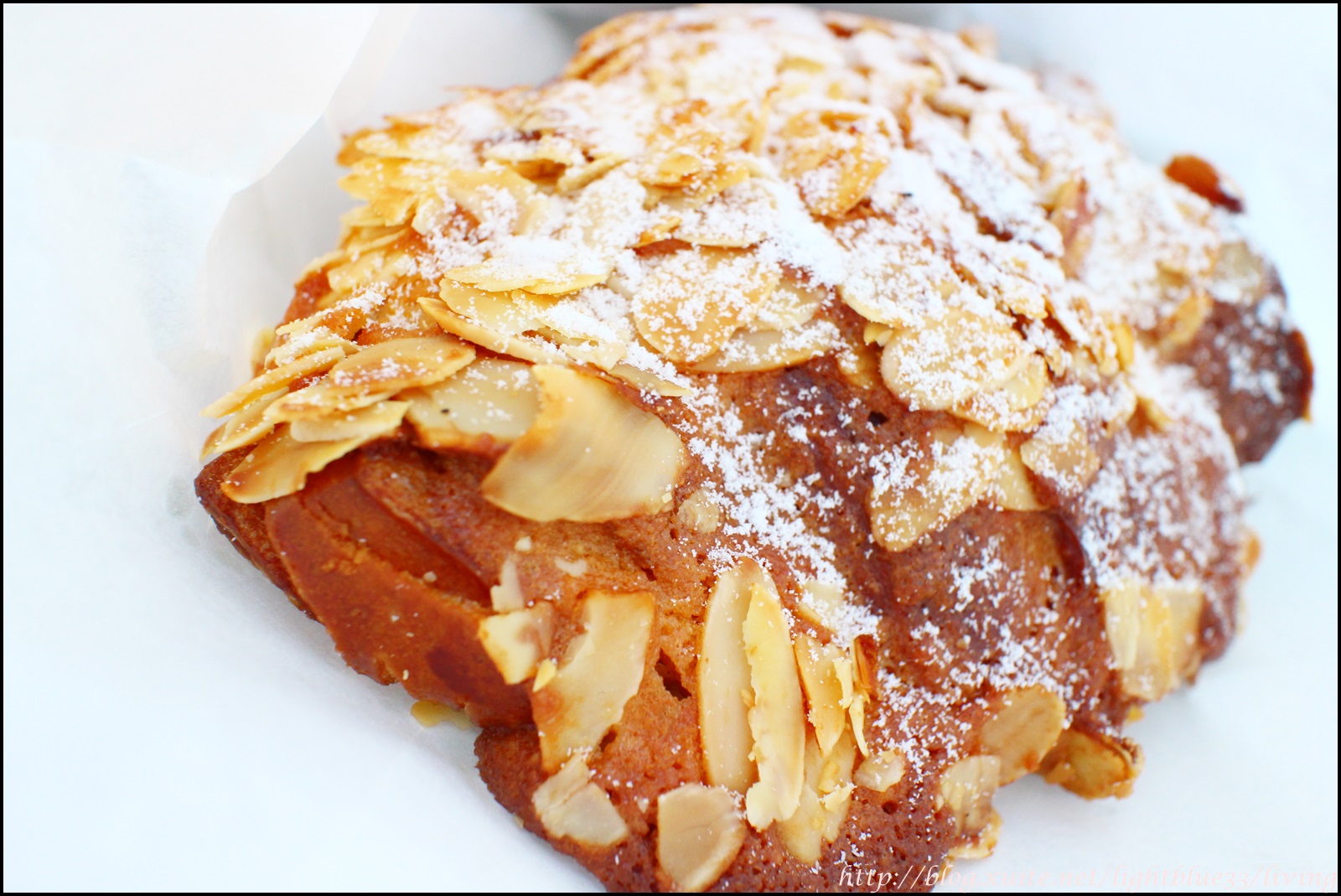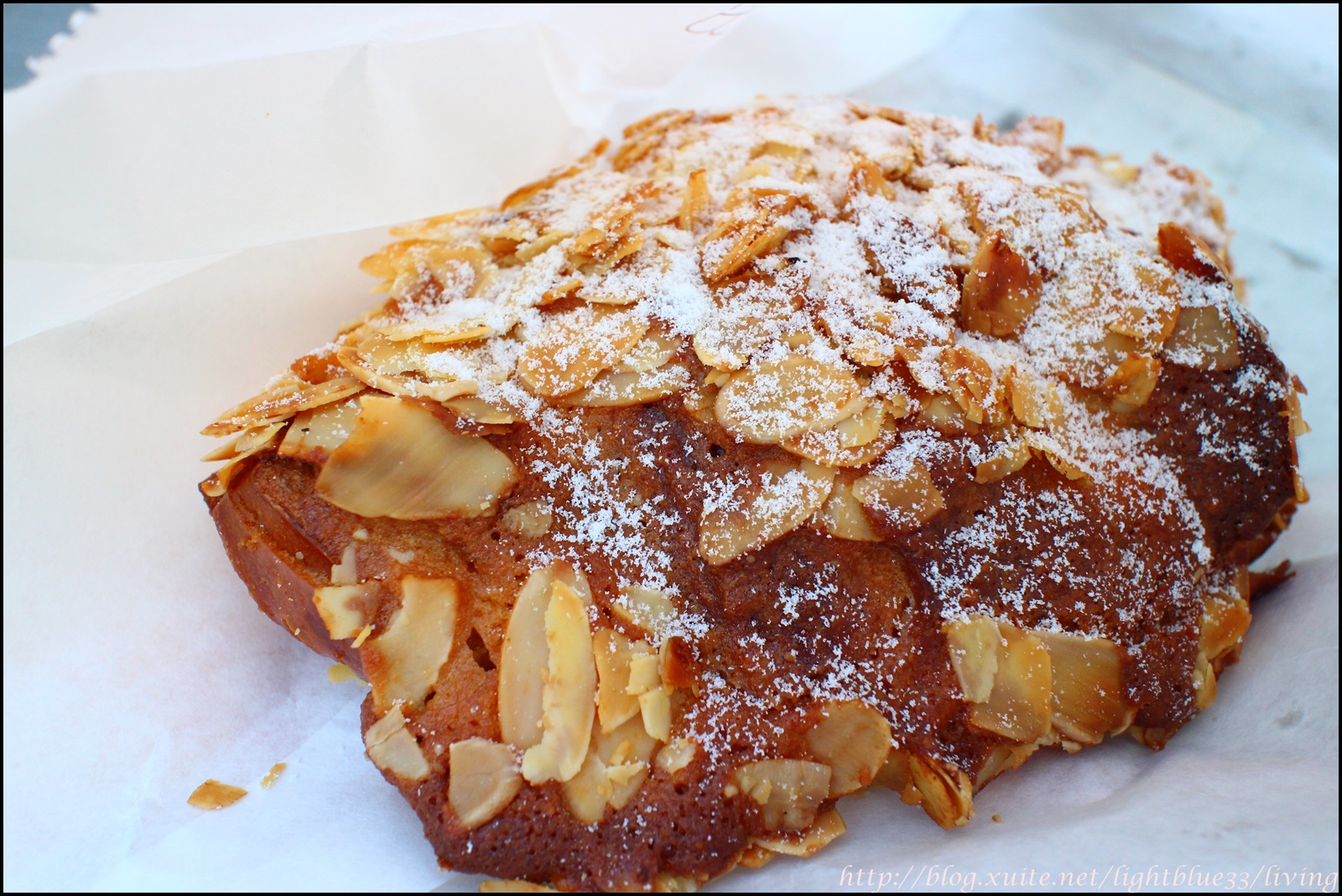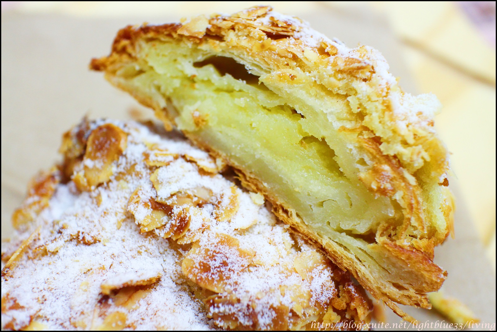 切半可以看到裡面有滿滿的杏仁餡,但是同時也會發現可頌的層次並不是很明顯,入口之後雖然杏仁餡香而不甜膩,但是果然沒有可頌的酥脆感,讓我有點失望