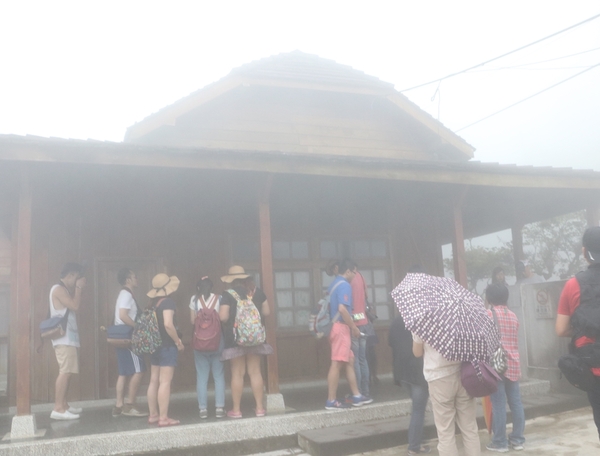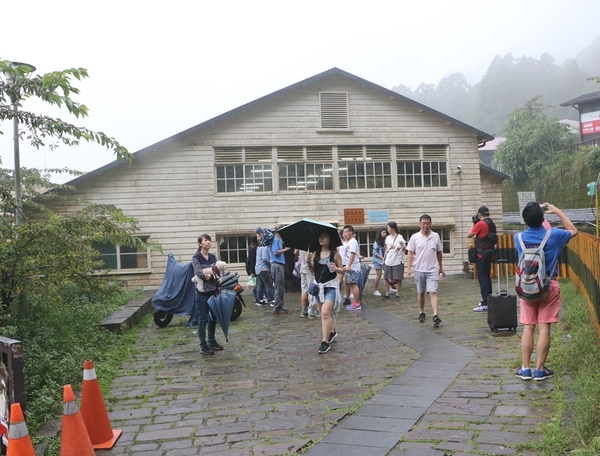 霧漸漸散退,細雨緊接著跟來,檜木所建造的奮起湖百年舊車站在雨中看起來更有日式風情。