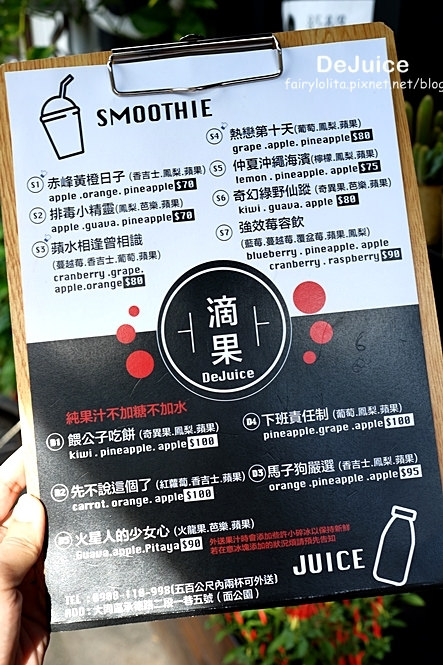 果汁強調不加一滴水、也沒有糖份的純天然滋味,另一個系列則是名字聽起來都很有意思的新鮮冰沙,有個大拇哥按個讚的,則是店家最推薦的口味。