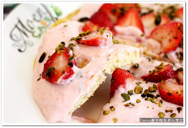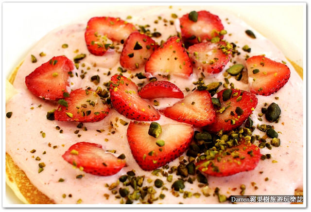 鬆餅上面鋪上一層粉色奶霜,上面有草莓切片再灑上開心果,從視覺外觀看起來繽紛粉嫩