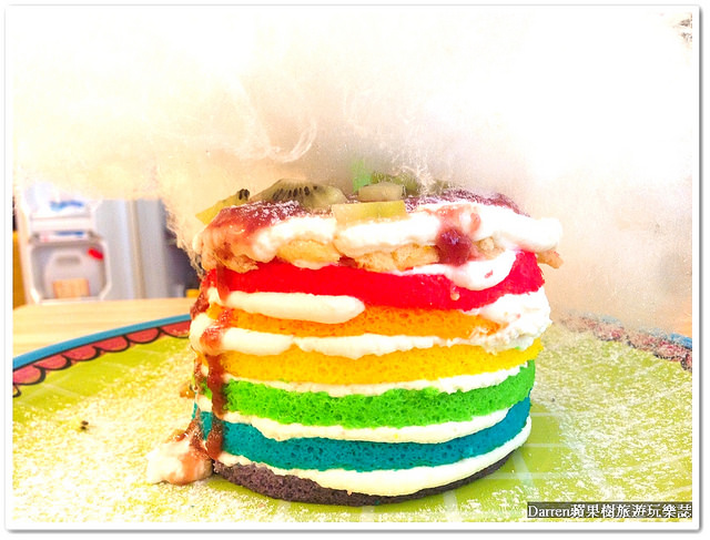 彩虹蛋糕吃起來綿綿QQ帶點濕潤搭配上鮮奶油還不錯,味道上輕柔入口即化不甜膩