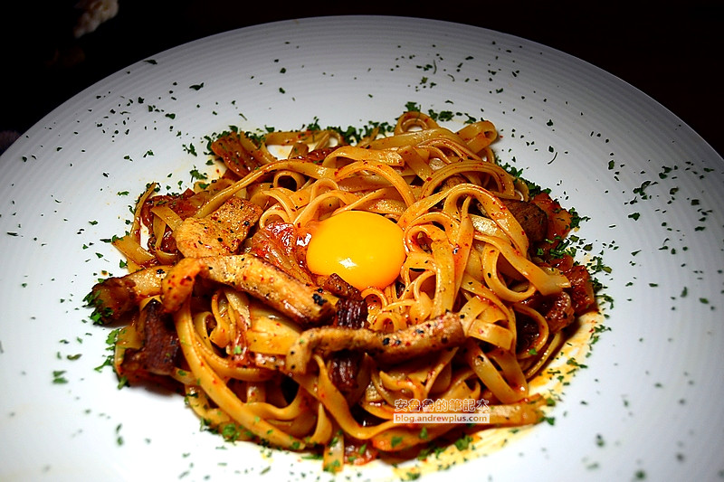 上頭擺放有機生蛋黃,混合入麵裡可增加滑順口感,整盤的酸辣度接近破表,莫非就老甕泡菜的驚人之處。松阪豬以肉絲的形態出現,外層酥脆帶點焦香。不能吃酸還有怕辣的朋友選用這道料理前要三思XD
