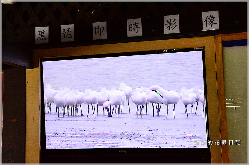 賞鳥亭室內還設有電視螢幕,實況轉播的黑面琵鷺即時影像供遊客們欣賞。