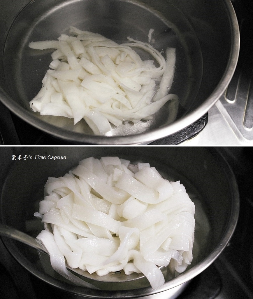 因粄條已經是熟食了,所以加熱至粄條軟化就可撈起瀝乾,